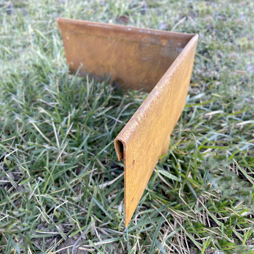 Angolare per bordure in acciaio Corten dimensioni 20×20 cm, altezza 9 cm, realizzata in lamiera da 1,2 mm per la creazione di angoli a 90° aiuole e bordure.