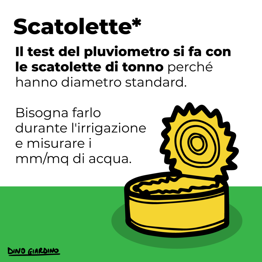 Il test del pluviometro si fa con le scatolette di tonno perché hanno diametro standard. Bisogna farlo durante l’irrigazione e misurare i mm/mq di acqua.