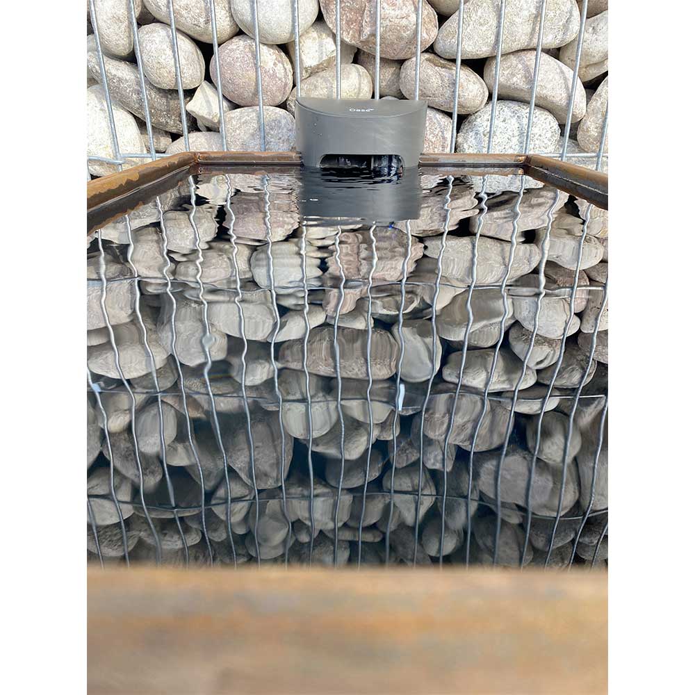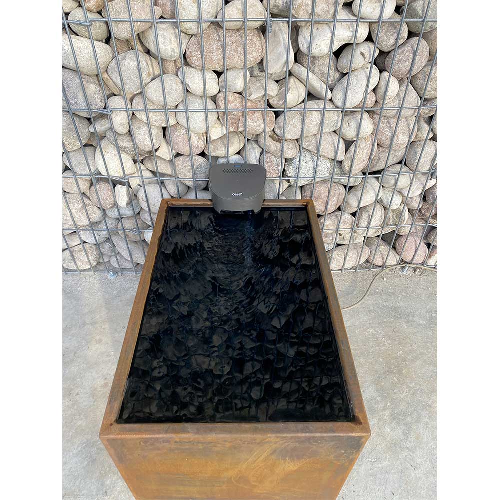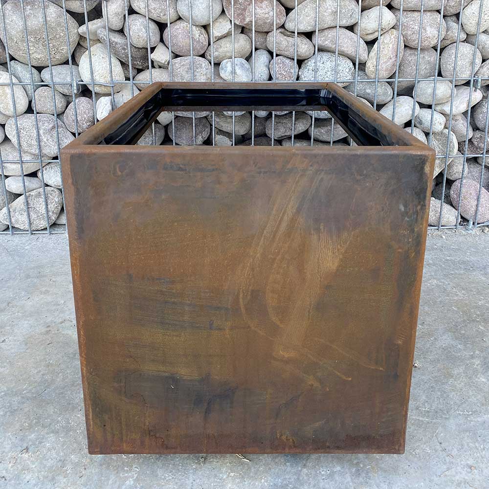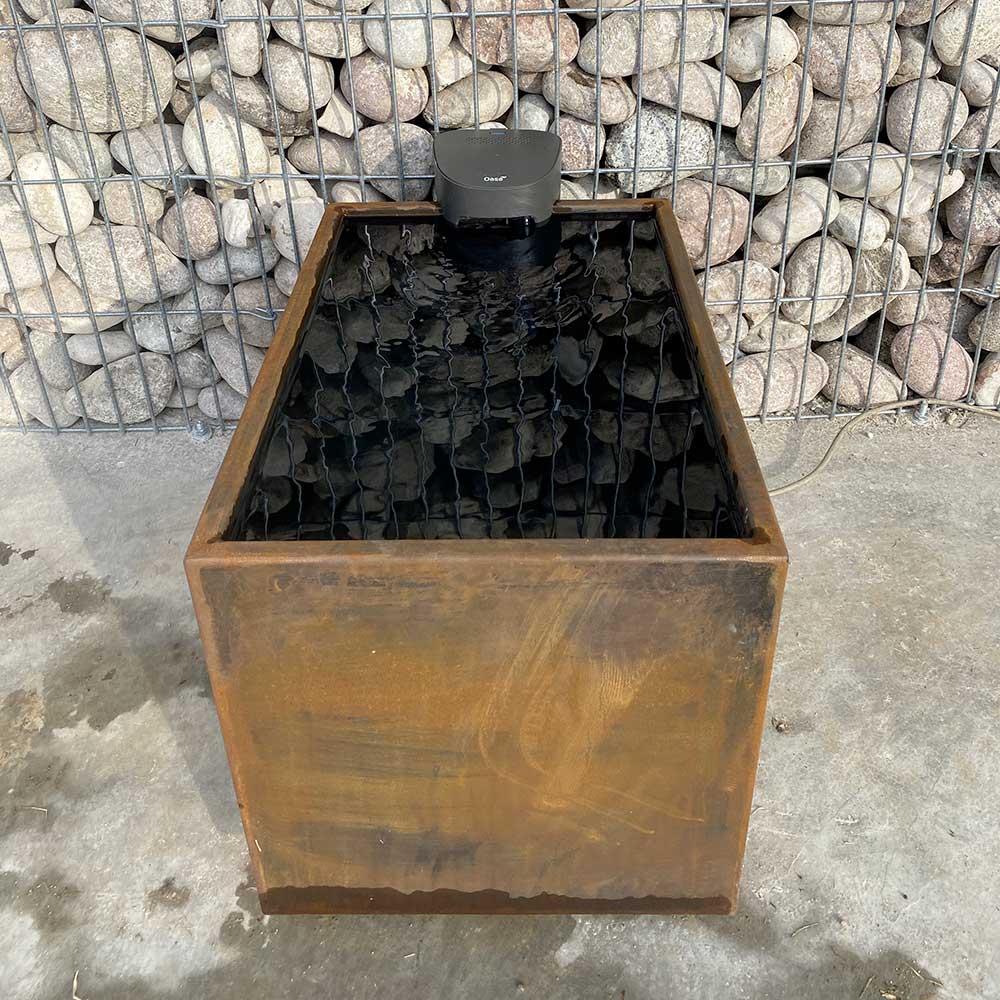 Vasca d’acqua in acciaio Corten pretrattato di dimensioni 80x40x40h, realizzata in lamiera da 2 mm con telo impermebaile in PVC di colore nero.