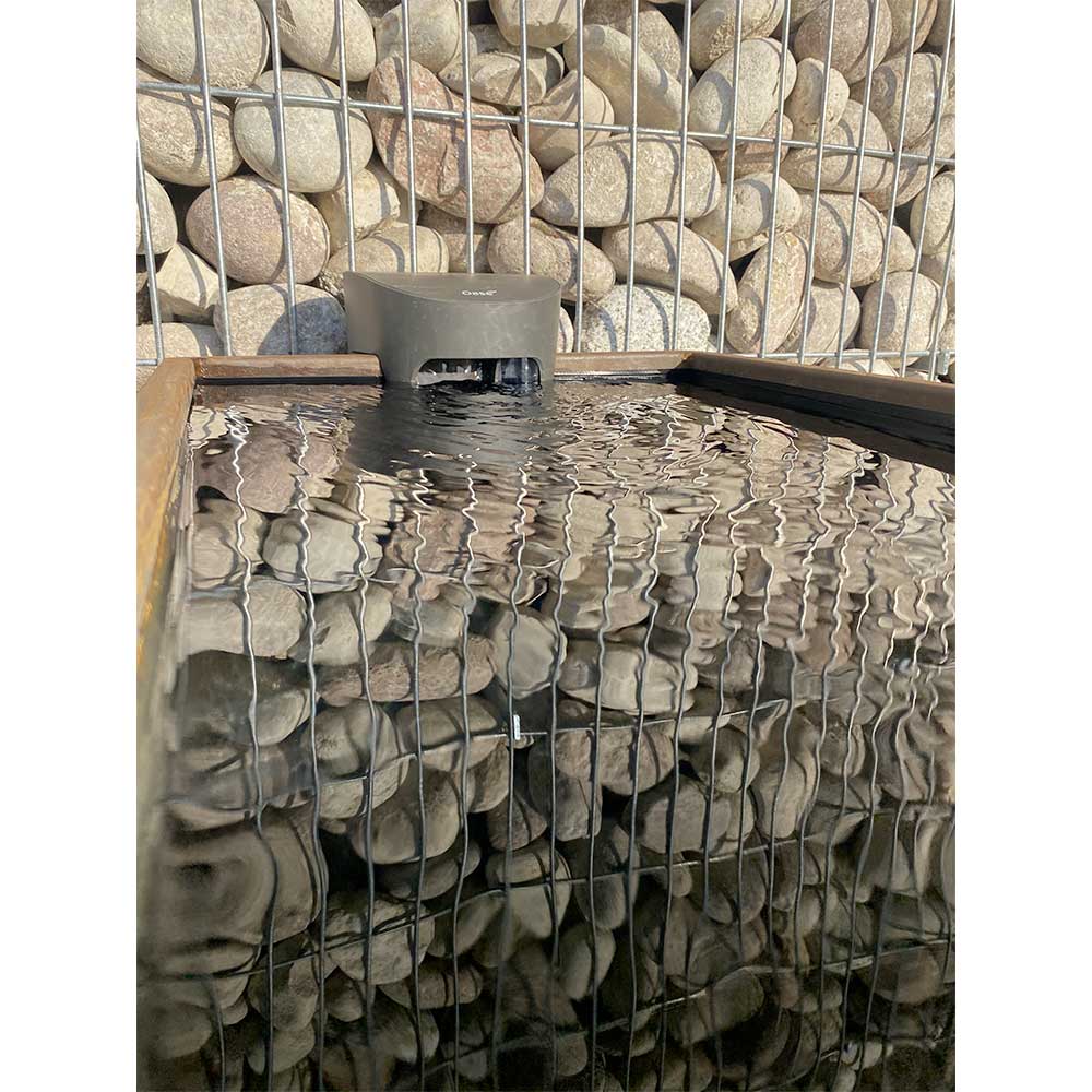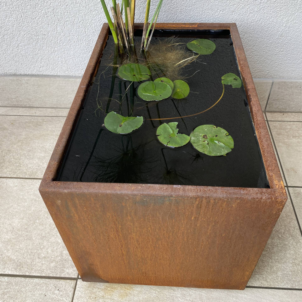 Vasca d’acqua in acciaio Corten pretrattato di dimensioni 80x50x50h, realizzata in lamiera da 2 mm con telo impermeabile in PVC di colore nero.