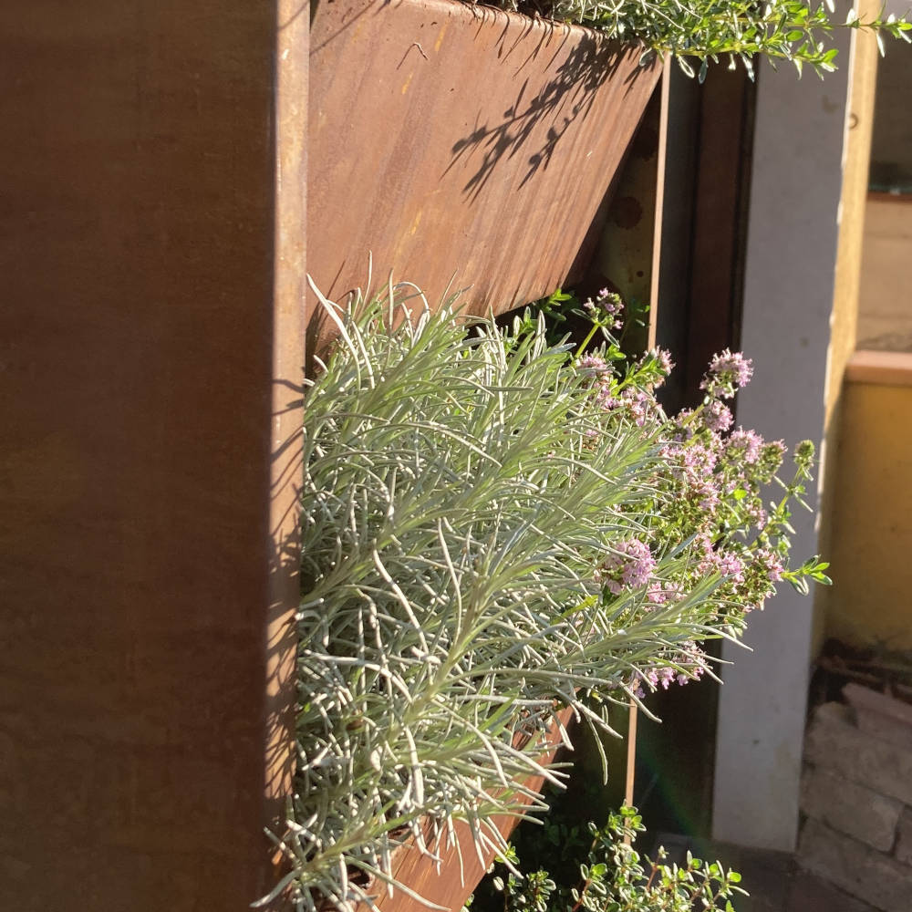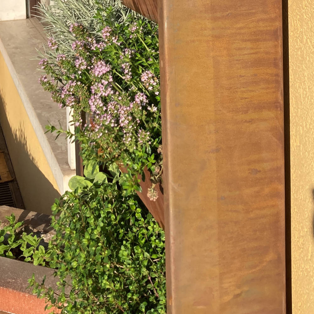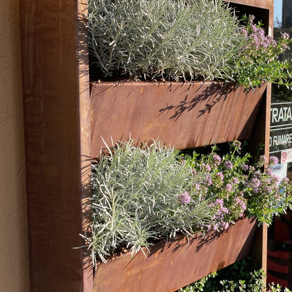 La lamiera utilizzata è da 1,5 mm in corten, con vasca di accumulo, foro di drenaggio e predisposizione per irrigazione con fori per ala gocciolante.